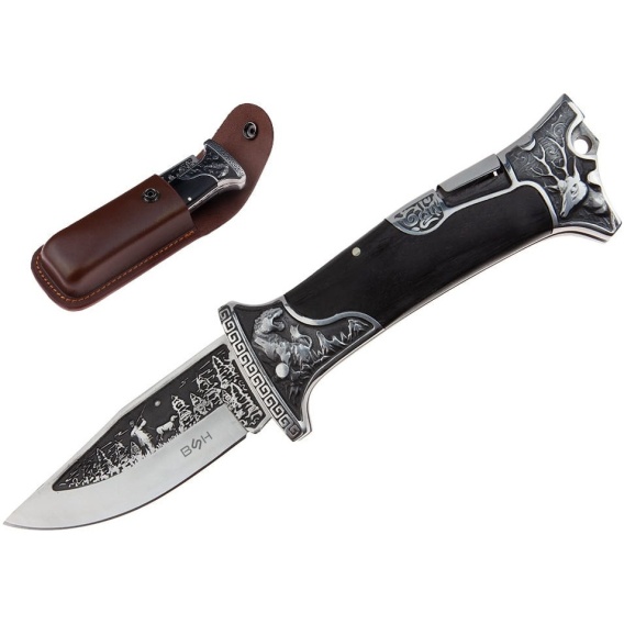 BSH Adventure N-064CPS to potężny i bogato zdobiony nóż myśliwski o wadze 330,0 g, który łączy kolekcjonerską estetykę z pełną funkcjonalnością narzędzia roboczego. Głownia o profilu clip point ze stali 440 o grubości 3,5 mm z grawerem myśliwskim, w połączeniu z ergonomiczną rękojeścią z drewna i metalu oraz blokadą back lock, stanowi niezawodne i eleganckie wsparcie podczas wypraw outdoorowych.
