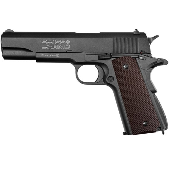 Wykonana w całości z metalu, ciężka replika-wiatrówka P1911. Pistolet strzela śrutem kulistym typu BB (4,5 mm). Napęd stanowi 12-gramowy nabój CO2 umieszczany w magazynku mieszczącym 18 śrucin. Pistolet działa - w przeciwieństwie modelu na ostrą amunicję - zarówno w systemie SA (Single Action) jak i DA (Double Action). Pistolet na korpusie posiada oryginalne oznaczenia Swiss Arms, szwajcarskiej firmy zajmującej się produkcją broni strzeleckiej.