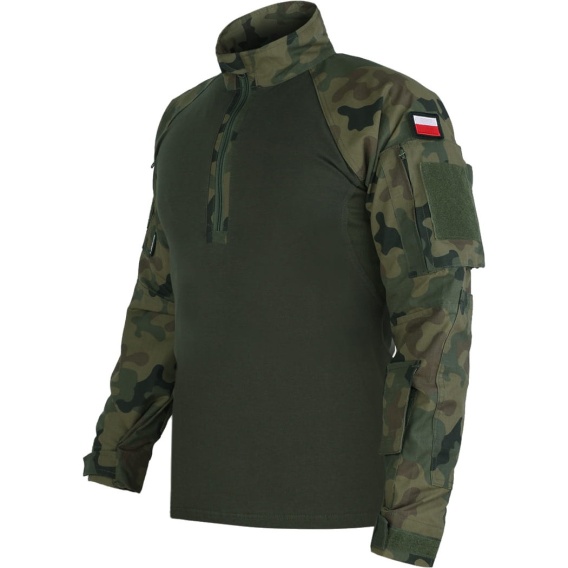 Hybrydowa konstrukcja materiałowa: tors wykonany z mieszanki bawełny i spandexu gwarantuje wysoką oddychalność oraz szybkie schnięcie pod balistyką. rękawy, barki i stójka powstały z wytrzymałego splotu rip-stop, który skutecznie zapobiega rozdarciom i przetarciom podczas czołgania się lub poruszania w gęstym terenie leśnym, zachowując przy tym optymalny komfort cieplny.