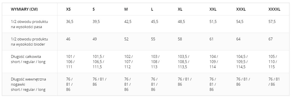 Spodnie oprócz regulatorów ściągaczy pasa nie posiadają metalowych elementów - zapinane są na guziki, na które zapinany jest również rozporek. Wspomniane regulatory ściągaczy pozwalają dopasować obwód w pasie bez konieczności zakładania paska do spodni. Przednie szlufki z pętlami znajdujące się na froncie umożliwiają dowiązywanie dodatkowego wyposażenia np. taktycznej smyczy.