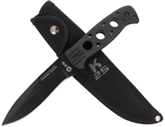 Rękojeść - z czarnego anodowanego aluminium zapewnia wytrzymałość przy jednoczesnym zachowaniu niskiej masy. Jej profilowana forma i tekstura powierzchni wspierają stabilność chwytu w trudnych warunkach, takich jak deszcz, błoto czy pot. Otwór na linkę w tylnej części umożliwia mocowanie noża do wyposażenia lub zastosowanie linki zabezpieczającej. W zestawie znajduje się pochwa z nylonu, umożliwiająca bezpieczne i wygodne przenoszenie na pasie lub oporządzeniu taktycznym. Całość oferuje użytkownikowi solidność, nowoczesną estetykę i pełną gotowość operacyjną.
