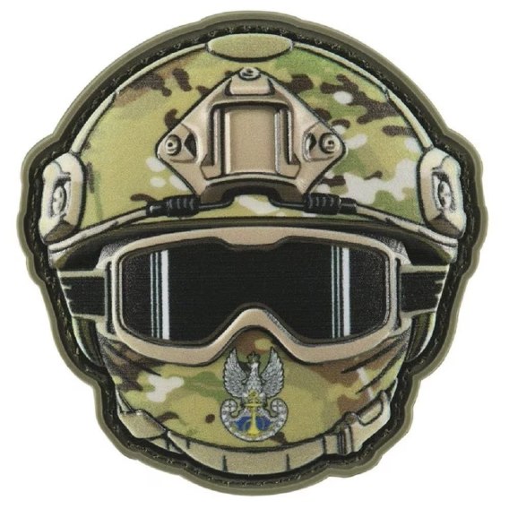 Naszywka typu Morale Patch przedstawiająca zamaskowane chustą emoji w wojskowym hełmie. Na chuście widoczny jest polski Orzeł Marynarki Wojennej. Wykonana została z elastycznego oraz trwałego materiału PVC. Dzięki zastosowanej technice 3D wszystkie elementy emblematu są wypukłe i wyraźnie widoczne.