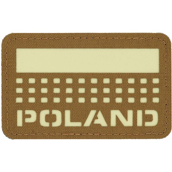 Oryginalna naszywka wykonana z wytrzymałej Cordury 500D z wyciętym w technologii Laser Cut napisem Poland oraz pikselową flagą. Brzegi tkaniny nie strzepią się, a naszywka zachowuje swój kształt. Wzór został wykonany z materiału luminescencyjnego, który emituje światło w ciemności.