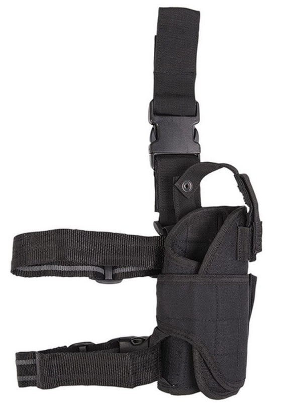 Kabura udowa od firmy Mil-Tec, wykonana z Cordury, dla osób praworęcznych, typu uniwersalnego - pasuje do większości popularnych modeli broni krótkiej dzięki możliwości regulacji. Posiada dodatkową kieszeń na zapasowy magazynek.
