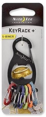 W skład zestawu wchodzi brelok z malowanej na czarno stali nierdzewnej wraz z zintegrowanym otwieraczem do butelek oraz 6 różnokolorowych, pomagających w identyfikacji kluczy, karabinków S-Biner w rozmiarze #0.