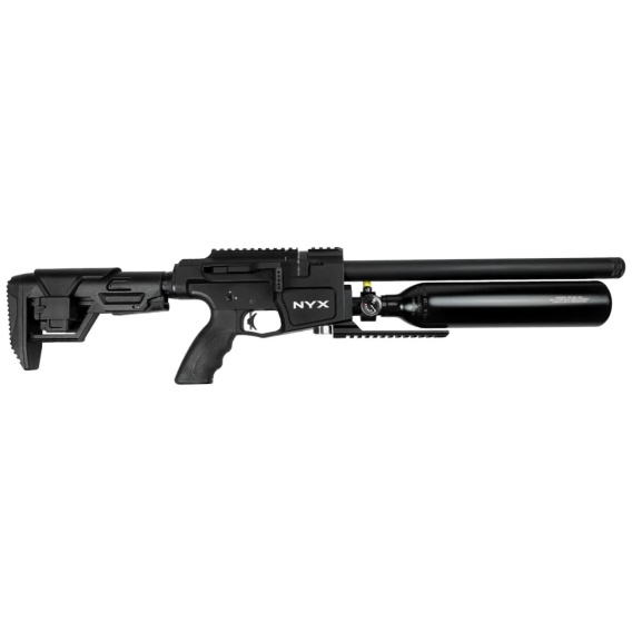 Reximex NYX Compact, nowoczesna, kompaktowa wiatrówka PCP w praktycznej osadzie taktycznej z chwytem pistoletowym. Dzięki teleskopowej kolbie w systemie AR oraz regulowanej bace policzkowej można karabin w pełni dostosować do swoich preferencji. Pojemny zbiornik powietrza 425cc zadowoli miłośników długiego strzelania, bez martwienia się o uzupełnianie kartusza. Wiatrówkę wyposażono w precyzyjną gwintowaną lufę ze zintegrowanym tłumikiem, regulator ciśnienia, biathlonową dźwignię przeładowania Side Lever, szynę na optykę 22 mm, matchowy język spustowy o regulowanej twardości. Dostępny w kalibrach: .177 (4.5 mm), .22 (5.5 mm), .25 (6.35 mm).