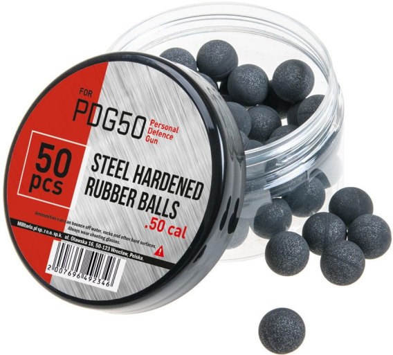 Zapas pięćdziesięciu gumowo-metalowych kul ćwiczebnych kaliber 0.50 cala do pistoletów, karabinków i strzelb działających w systemie RAM (Real Action Marker).