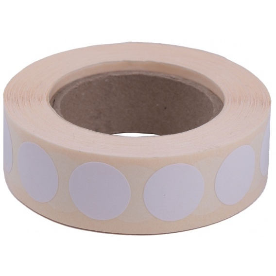 Rolka białych zaklejek do przestrzelin pistoletowych i karabinowych. Średnica pojedynczej zaklejki wynosi 16 mm.